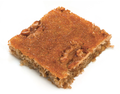 Kadayif is the general name of the dessert as a whole, but more specifically, the batter. The result of the batter being poured onto a round hot plate appears similar to pancakes, except only one side is cooked, then folded. The pastry is filled with either unsalted cheese or a mixture of any of hazelnuts, walnuts, almonds, pistachios, raisins, powdered sugar, vanilla extract, and cinnamon. It is then deep-fried or, less commonly, baked and served with a hot syrup or sometimes honey.