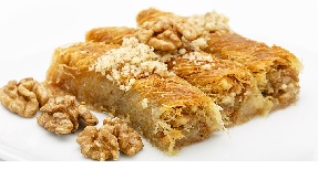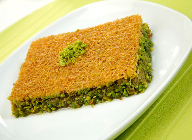 Kadayif is the general name of the dessert as a whole, but more specifically, the batter. The result of the batter being poured onto a round hot plate appears similar to pancakes, except only one side is cooked, then folded. The pastry is filled with either unsalted cheese or a mixture of any of hazelnuts, walnuts, almonds, pistachios, raisins, powdered sugar, vanilla extract, and cinnamon. It is then deep-fried or, less commonly, baked and served with a hot syrup or sometimes honey.